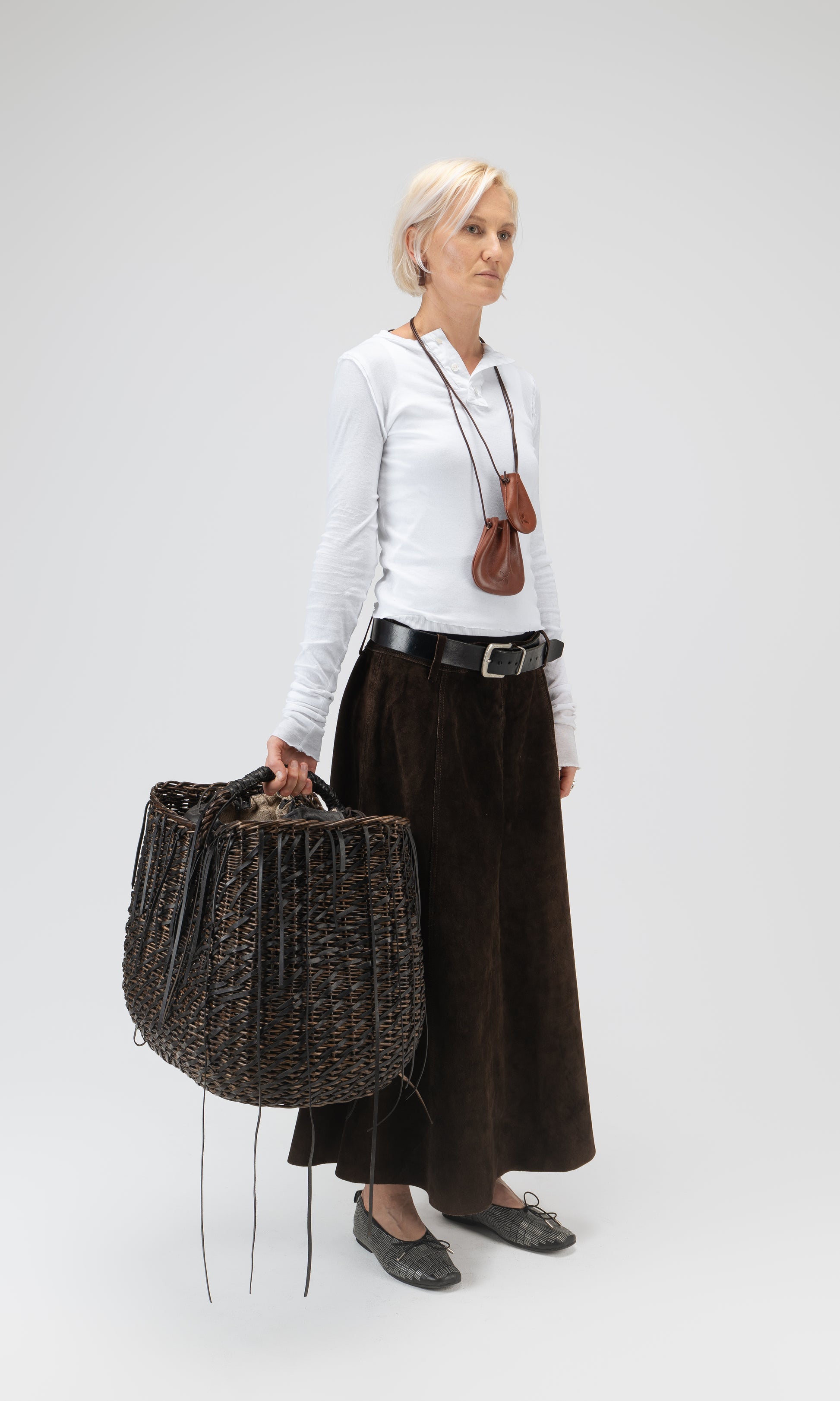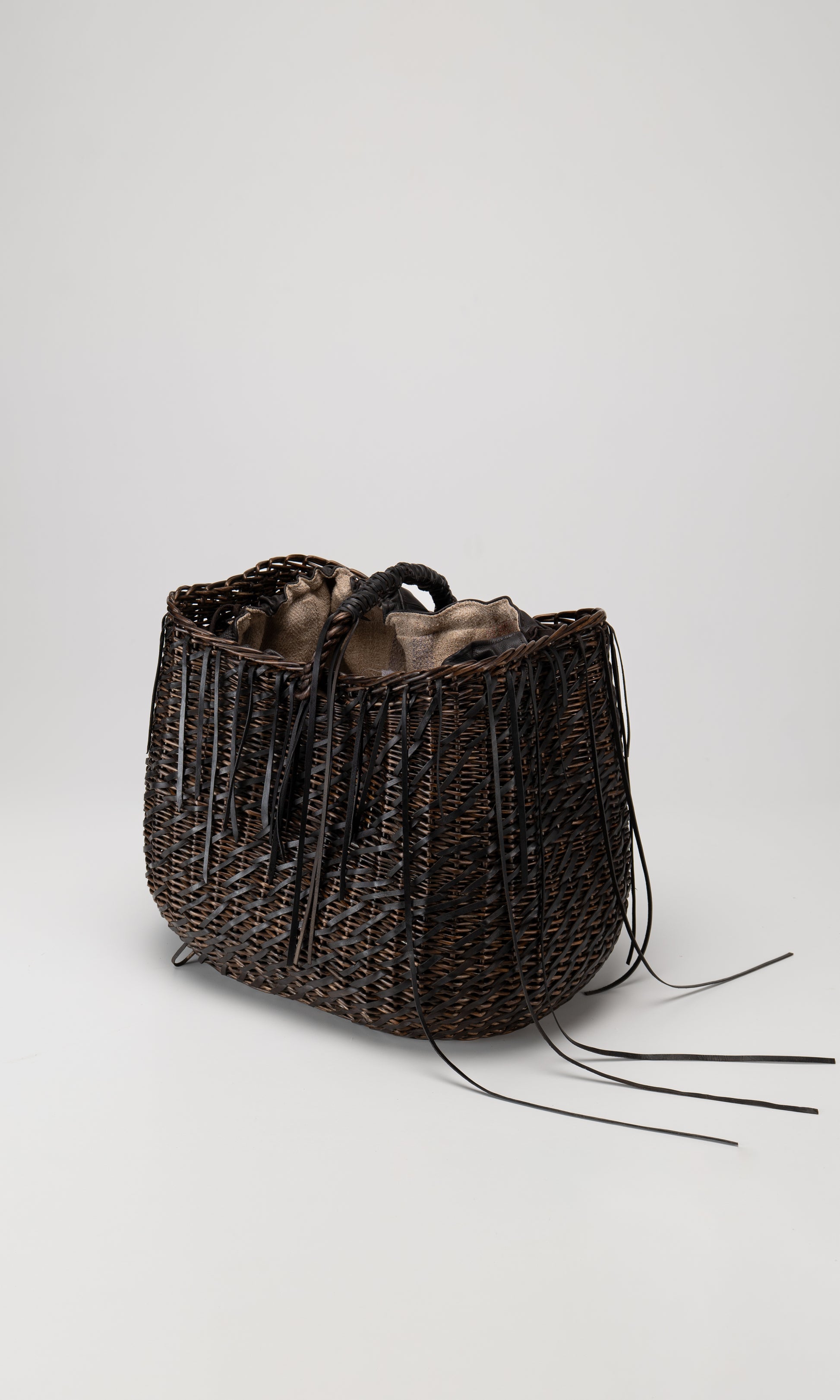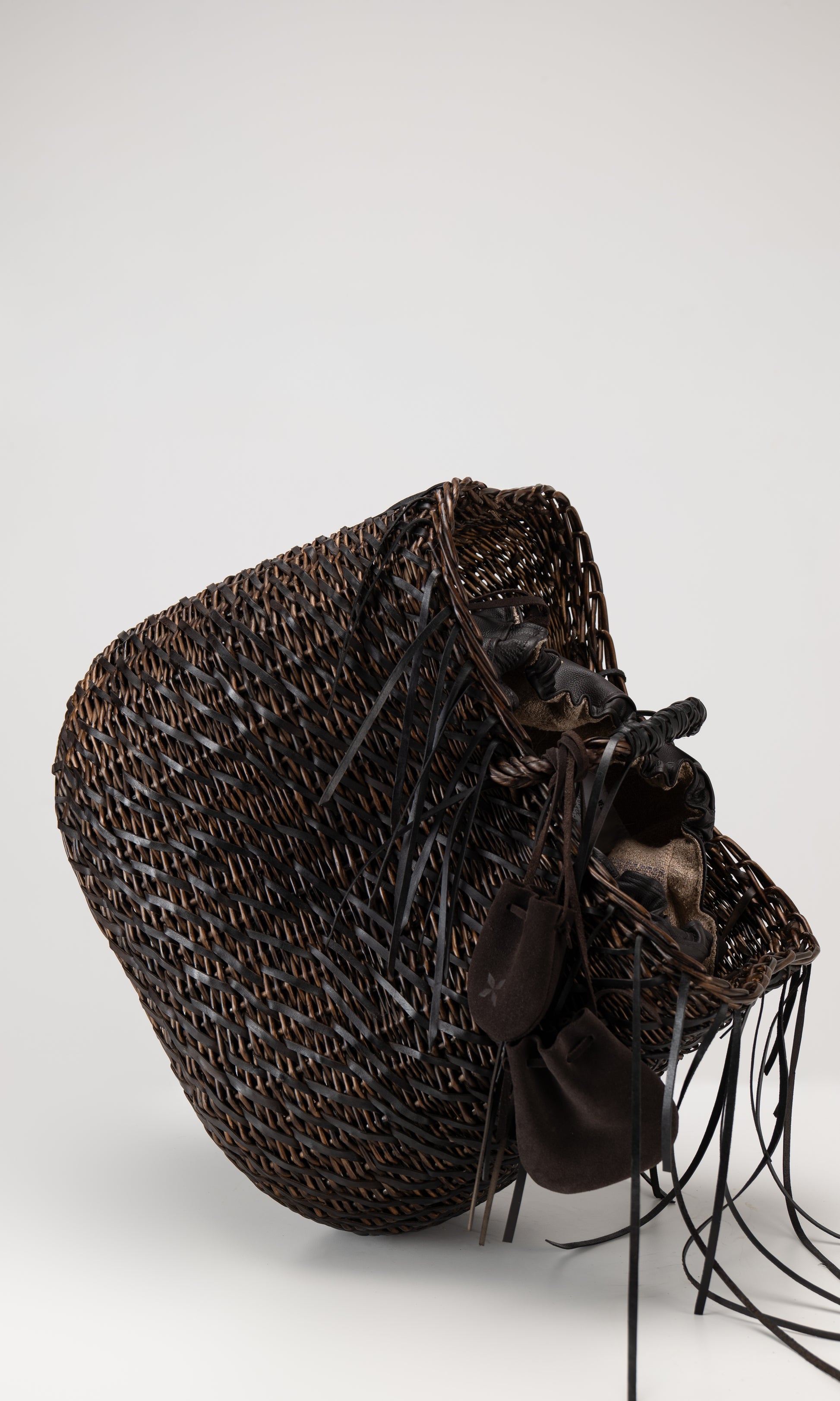 City Passenger is a wearable object constructed from willow entwined with untanned, naturally dyed leather. Drawing from traditional basketry, the piece is translated into an urban context shaped by movement, transit, and pause. Conceived as a traveler between worlds, City Passenger carries roots quietly through contemporary rhythm. Organic materials remain exposed and responsive, allowing time, use, and environment to continue shaping the object. Each piece is accompanied by a dust bag made from woven linen once used by the maker’s great-grandmother to store potatoes. Two detachable leather pouches are included; fully functional and designed for everyday use, they can be removed and carried independently.