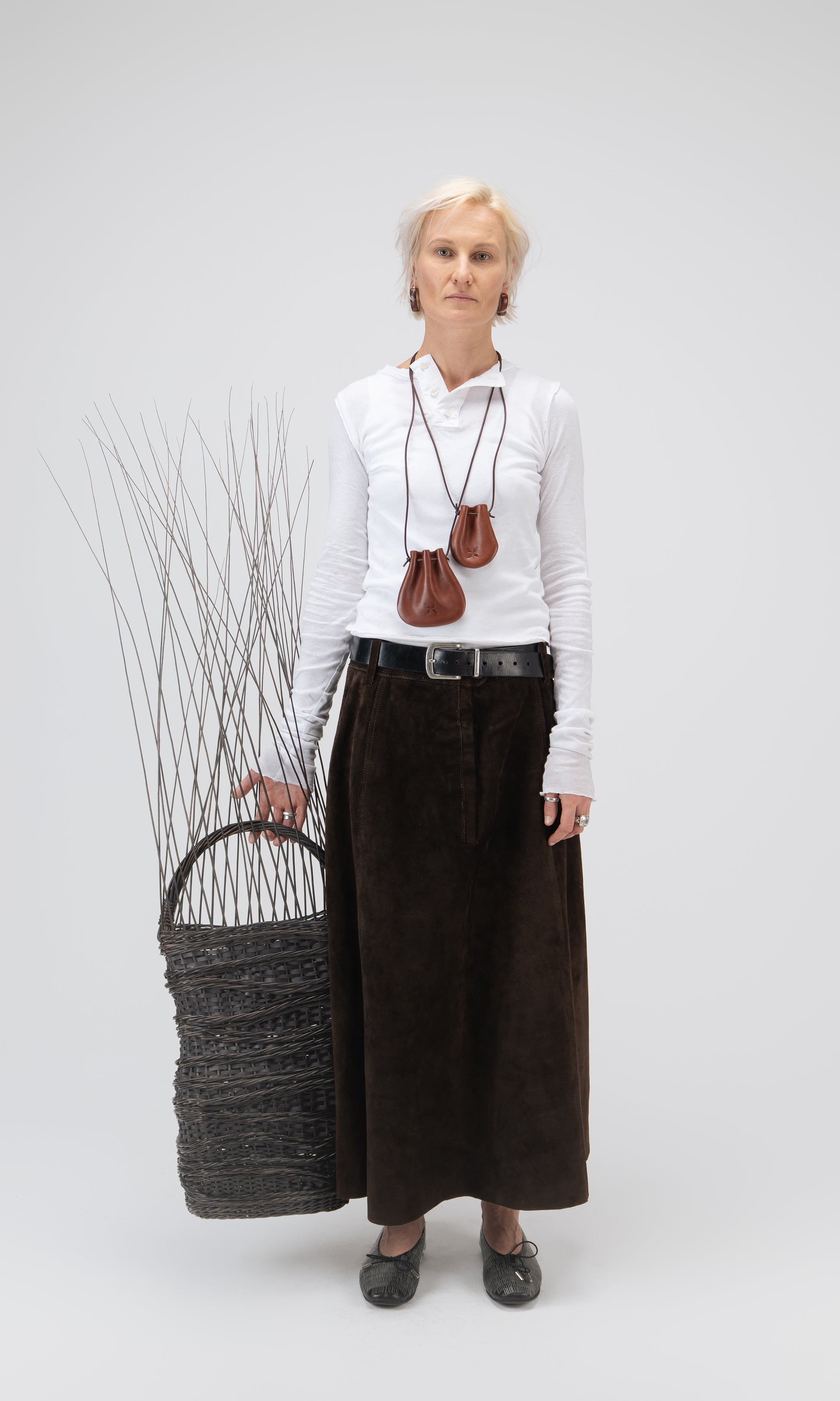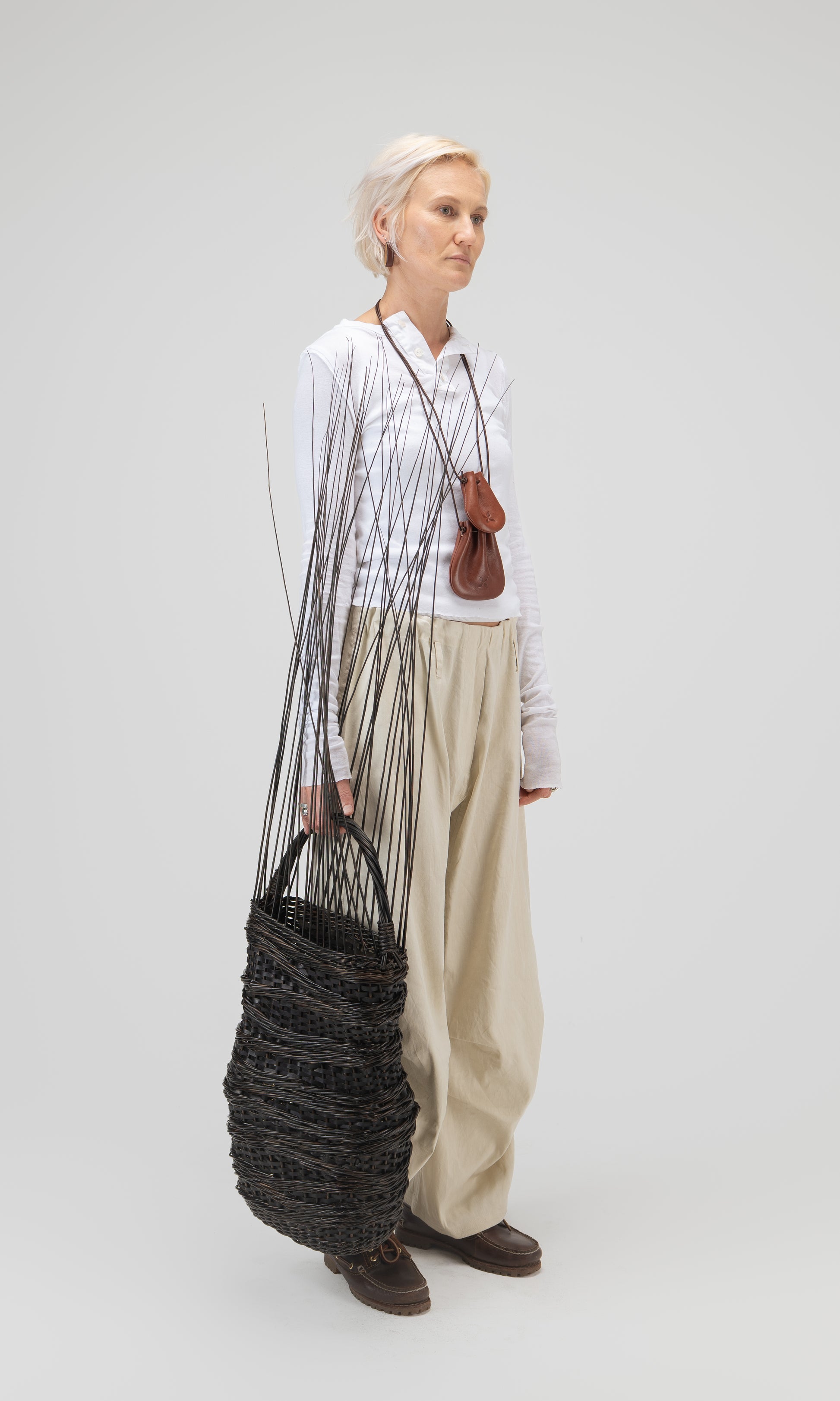 Please note: Fields Between Basket is a wearable object rather than a functional everyday bag. Due to its construction, it is not intended for prolonged wear.